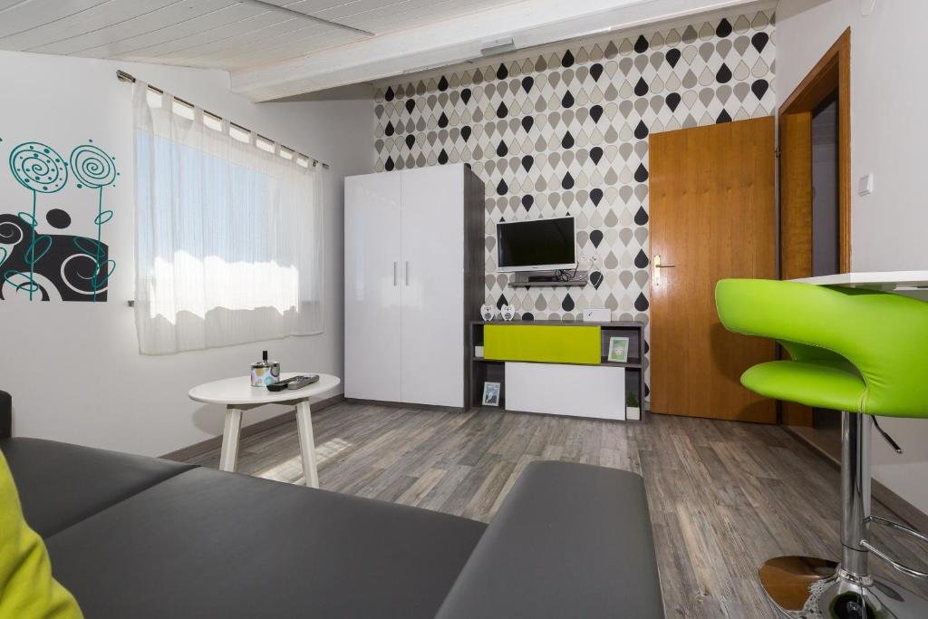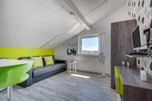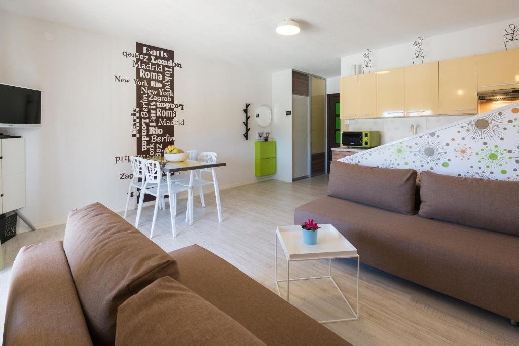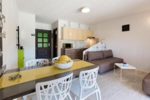 Studio apartments with equipped kitchens, dining table and two foldable sofas